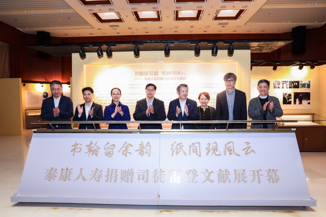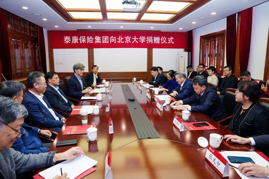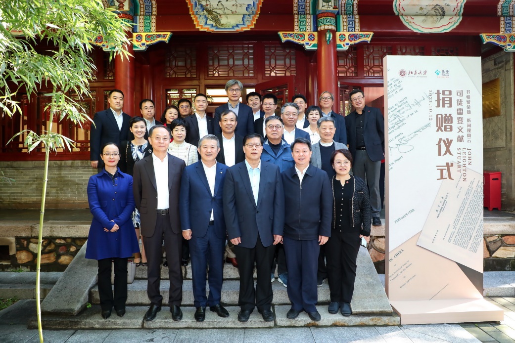 10月12日上午,由北京大学与泰康保险集团联合主办的“书翰留余韵,纸间现风云——泰康人寿捐赠司徒雷登文献展”在北京大学图书馆开展。展览开幕前,双方在北京大学临湖轩举行捐赠仪式。北京大学党委书记、教育基金会理事长邱水平,泰康保险集团董事长兼CEO陈东升,北京市文物局党组书记、局长陈名杰,国家文物局博物馆与社会文物司副司长吴旻,中国嘉德董事总裁胡妍妍,赛富投资基金创始管理合伙人、北京大学教育基金会理事阎焱,物美创始人、多点董事长张文中,汉能投资集团董事长陈宏等出席活动。北京大学校长郝平参观了文献展,北京大学党委副书记安钰峰,北京大学校长助理、秘书长孙庆伟陪同参观。捐赠仪式由北京大学副校长、教育基金会副理事长王博主持。
