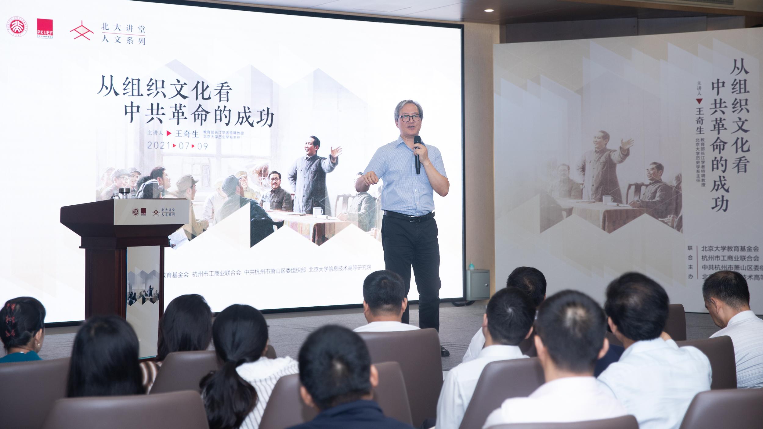 7月9日下午,“北大讲堂人文系列”第二讲《从组织文化看中共革命的成功》于北京大学信息技术高等研究院国际学术交流中心顺利开讲。本期讲座由教育部长江学者特聘教授、北大历史学系主任、中国近现代史专家王奇生教授主讲,杭州市工商联党组书记麻承荣、副主席吴隆、副主席周华,北大信息技术高等研究院副院长李祎,以及相关部门、企业界、公益界的百余位嘉宾出席本次盛会,活动由北大教育基金会副秘书长耿姝主持。