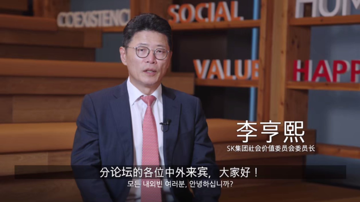 SK集团社会价值委员会委员长李亨熙以视频方式致辞。他表示,SK集团以创造社会价值为经营理念,长期以来持续不懈地创造企业社会价值和开展可持续经营,并在研发评估社会价值指标体系和制定测量方法的全球性标准等方面做出诸多研究和努力。李亨熙希望以此分论坛为契机,推广优秀的研究方法,促进实现进一步合作,大家共同努力为未来的可持续发展时代和应对新的社会问题做出里程碑式的贡献。