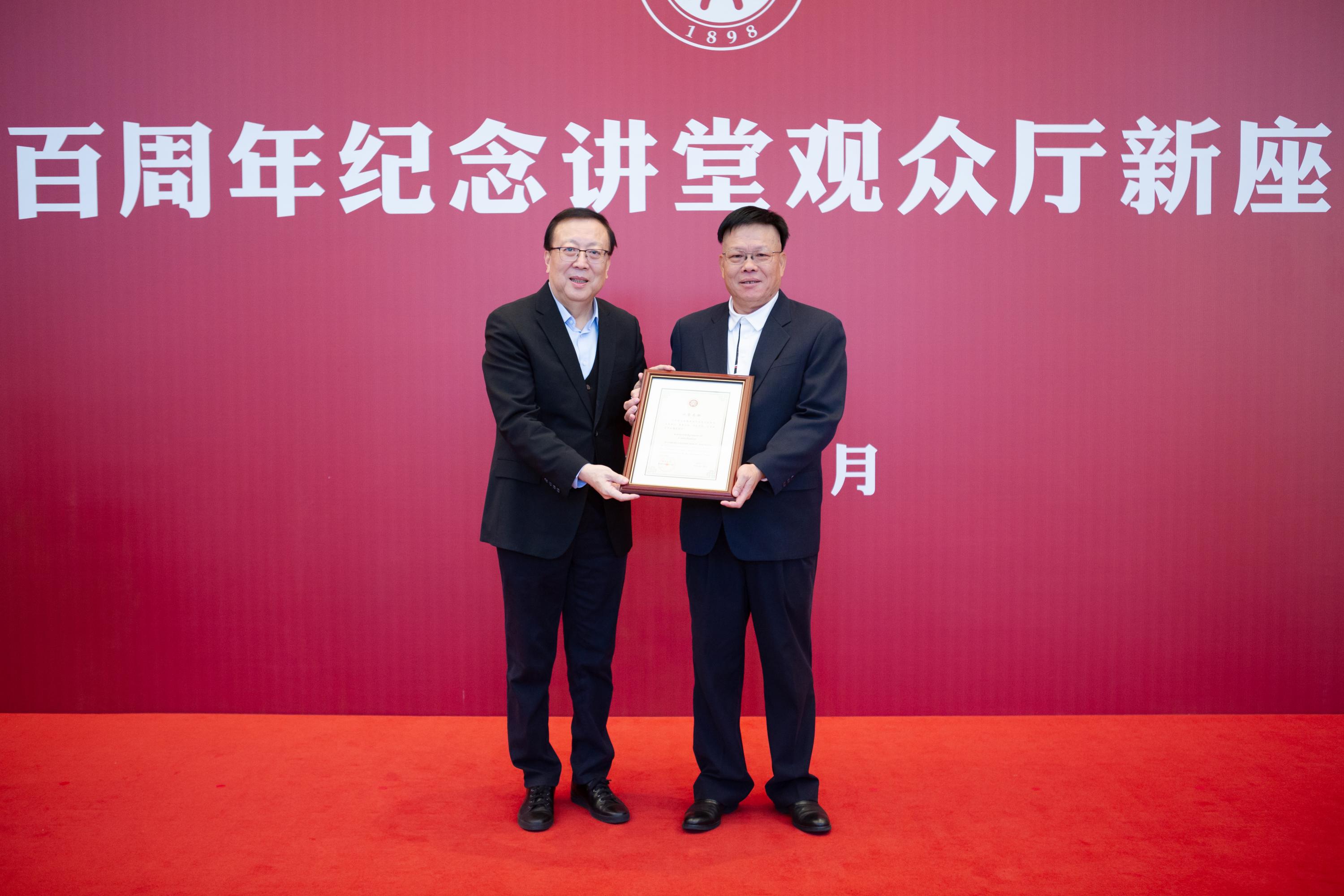 校领导和嘉宾为讲堂观众厅座椅捐赠纪念铜牌揭牌