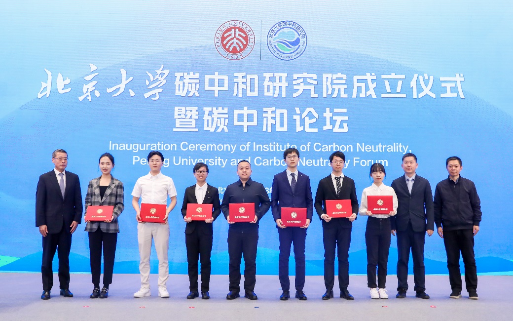 韩启德、赵英民、郝平、龚旗煌、郭正堂院士等到场嘉宾与碳中和研究院院长朴世龙院士共同为研究院成立揭牌。郝平向碳中和研究院指导委员会全体到场委员及研究院学术委员会主任、副主任颁发聘书。龚旗煌为朴世龙颁发研究院院长聘书。