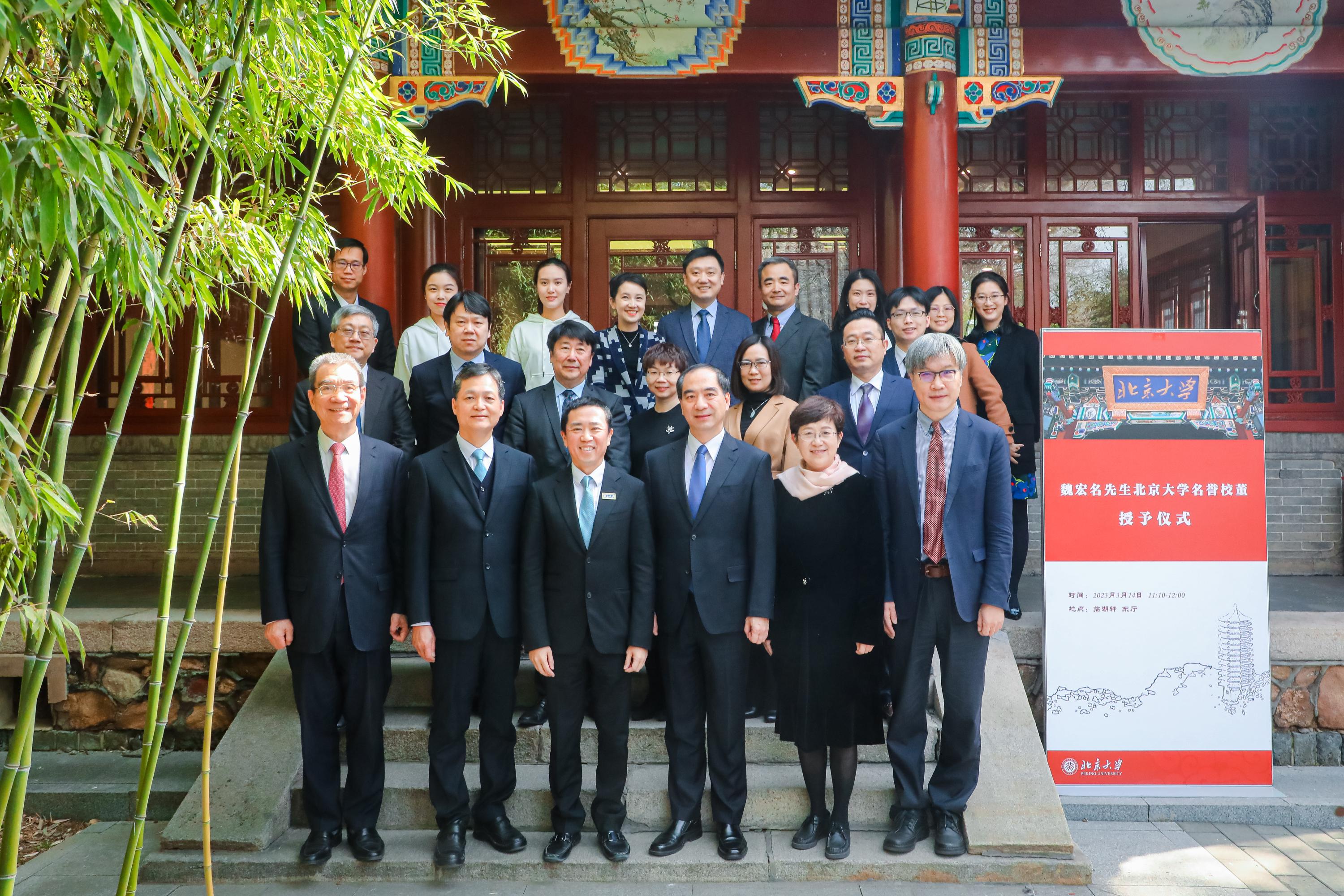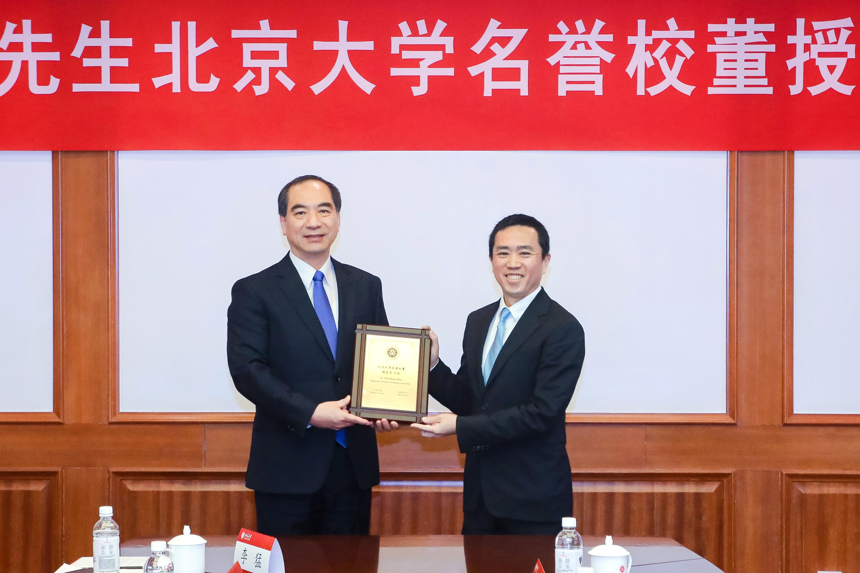 3月14日,魏宏名先生北京大学名誉校董授予仪式在北京大学临湖轩举行。魏宏名先生及家族和企业长期以来为北京大学的发展建设做出积极贡献,学校决定授予魏宏名先生北京大学名誉校董称号,共同为北大发展和中国高等教育事业贡献更大力量。