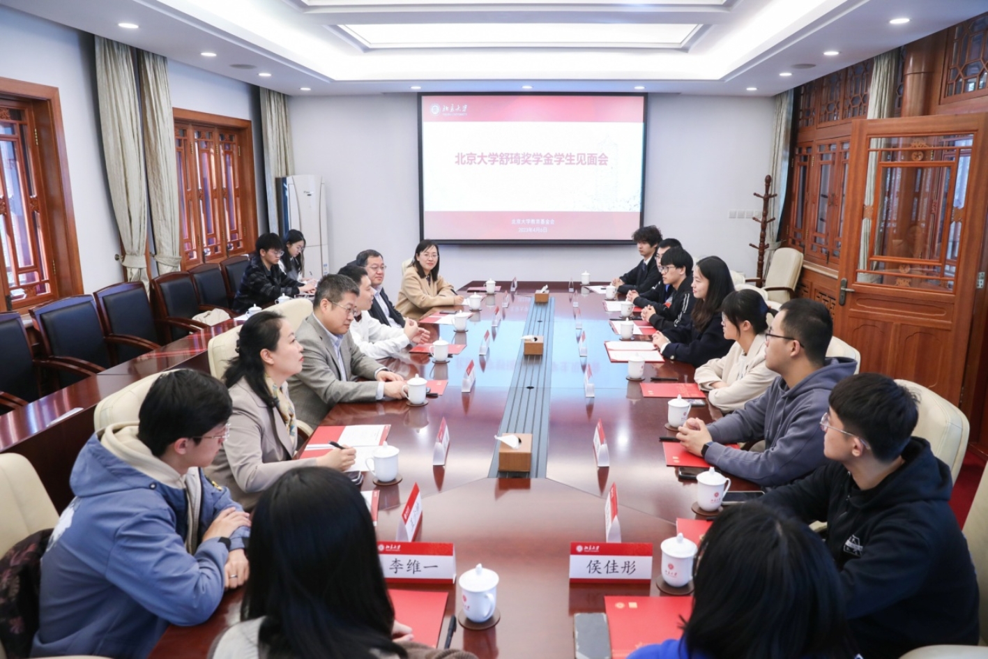 捐赠仪式前,北京大学党委书记、教育基金会理事长郝平会见了舒琦。他感谢舒琦近年来默默地对母校人才培养和科学研究事业的支持,为年轻校友回馈母校的热忱之心表示感动。郝平表示,希望舒琦继续关注母校,积极建言献策,为母校的发展而共同努力。