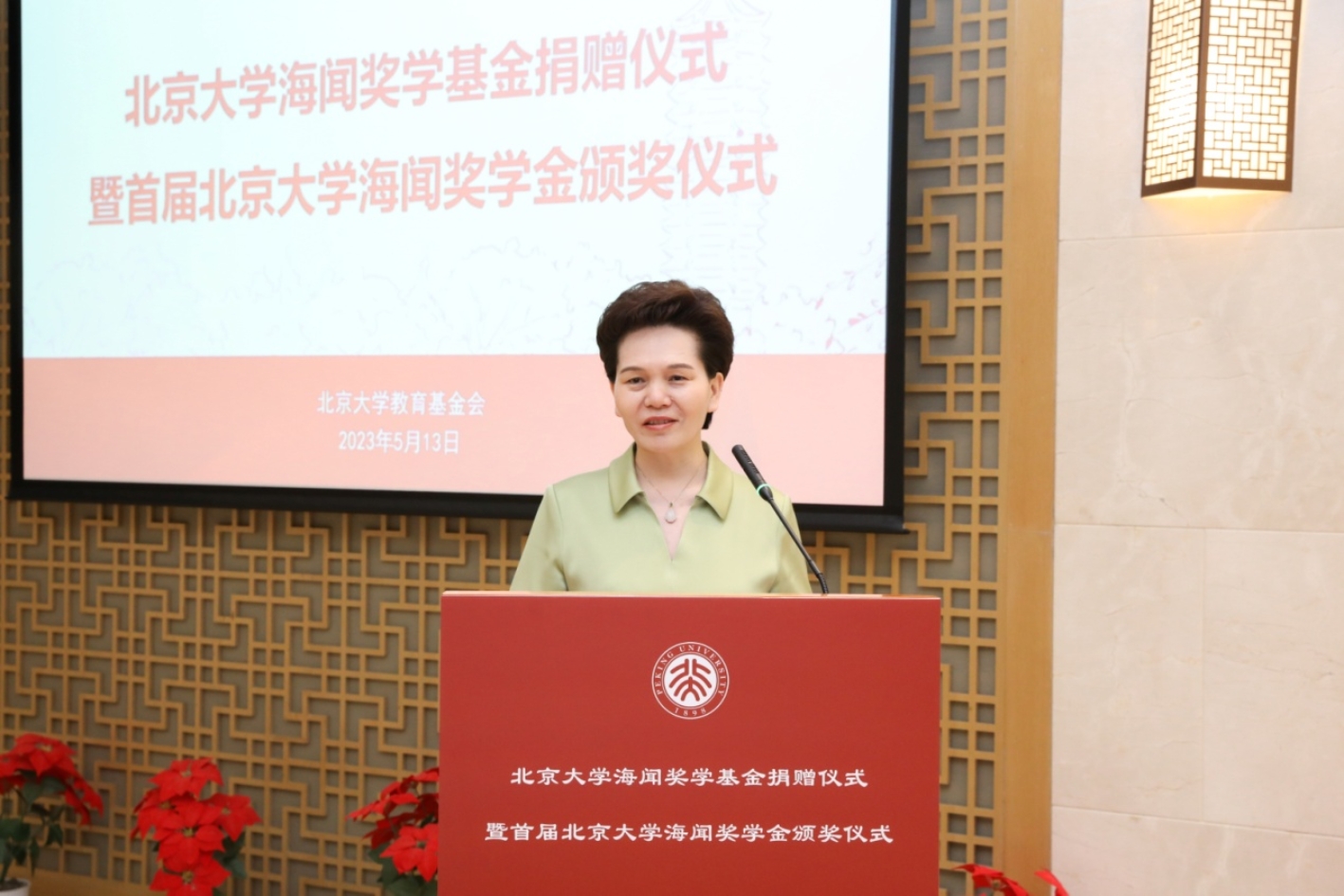 康利达集团董事长、北京大学汇丰商学院EMBA校友薛景霞作为捐赠方代表,分享了自己在北大学习的经历和收获。她表示,海闻身上的奋斗和创业精神深深感染着每一位学生,自己很荣幸能够参与支持海闻奖学金,也非常愿意为北大的发展贡献力量。她希望更多的年轻学子能够感受到一代代北大人爱心传递的力量,并勉励同学们为了国家和民族的发展学好基础学科,了解中华民族的过去、现在和未来。