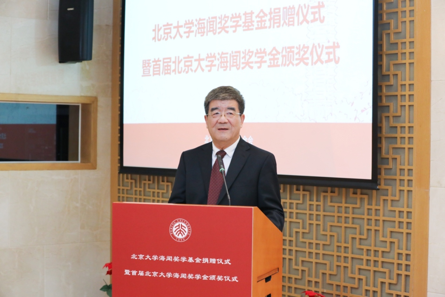 5月13日,北京大学海闻奖学基金捐赠仪式暨首届北京大学海闻奖学金颁奖仪式在教育基金会北大之友报告厅举行。北京大学党委书记、教育基金会理事长郝平,副校长、教务长、教育基金会副理事长王博,原副校长、汇丰商学院创院院长海闻教授和捐赠校友等出席仪式。教育基金会副秘书长耿姝主持仪式。