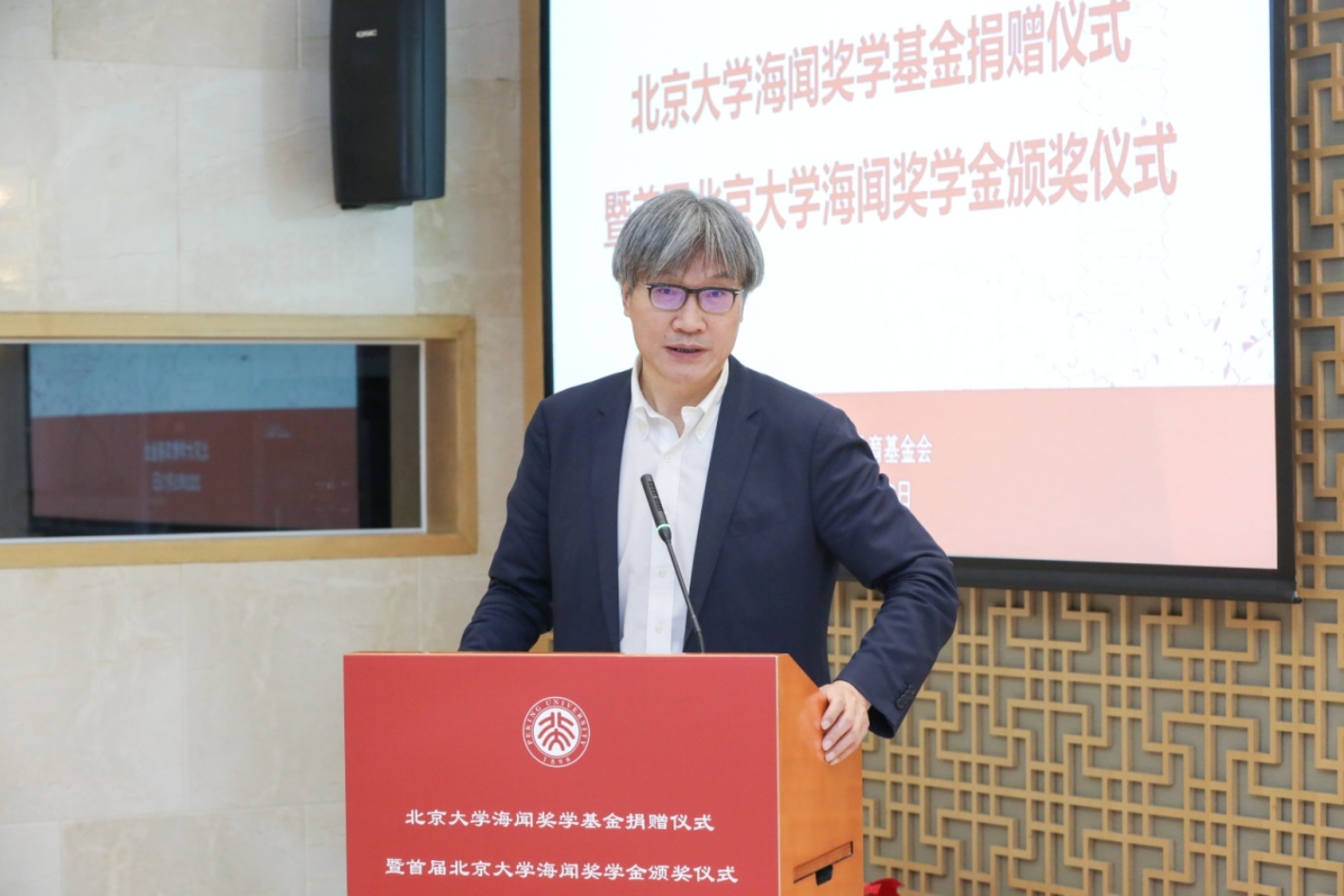 海闻、捐赠方代表和北大学生工作部部长、团委书记户国栋向获奖学生代表颁发奖学金证书。获奖学生代表、哲学系2019级本科生王子路表示,奖学金不仅是经济上的奖励,更是精神上的鼓舞,未来将继续秉承求知精神,做好专业工作的同时,保持开阔的视野,脚踏实地、精益求精,不负学校与海闻老师的希望与期许。