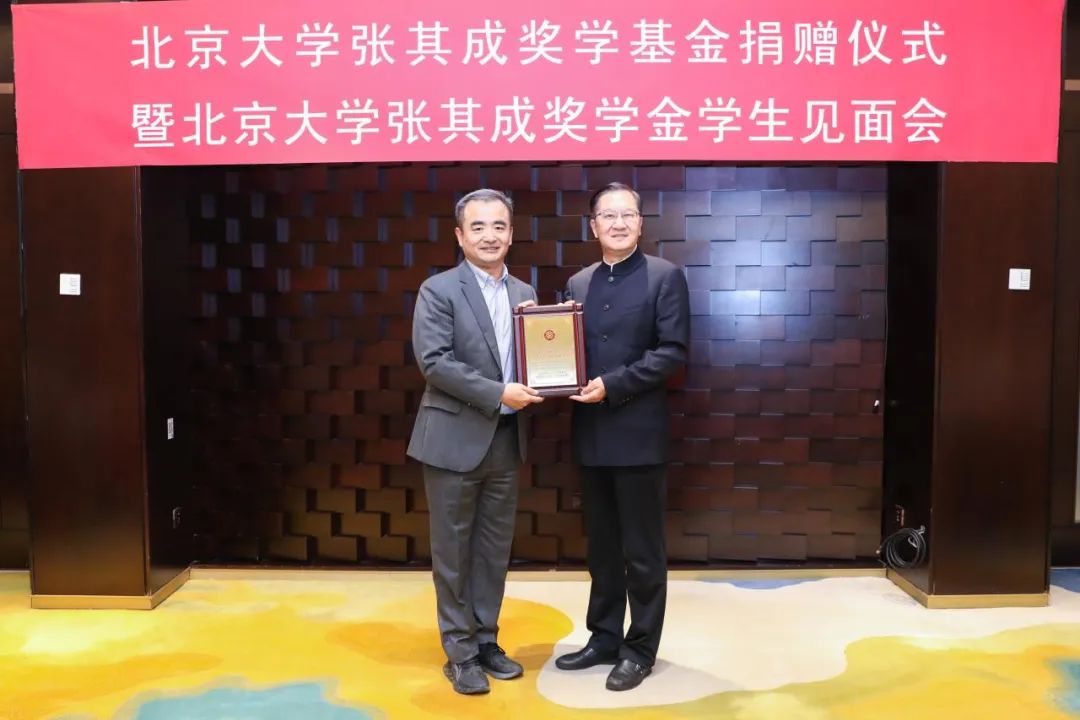 在全场热烈的掌声中,张其成向李宇宁递赠捐赠支票牌,并向获奖学生代表赠书。李宇宁向张其成颁发北京大学教育贡献奖。