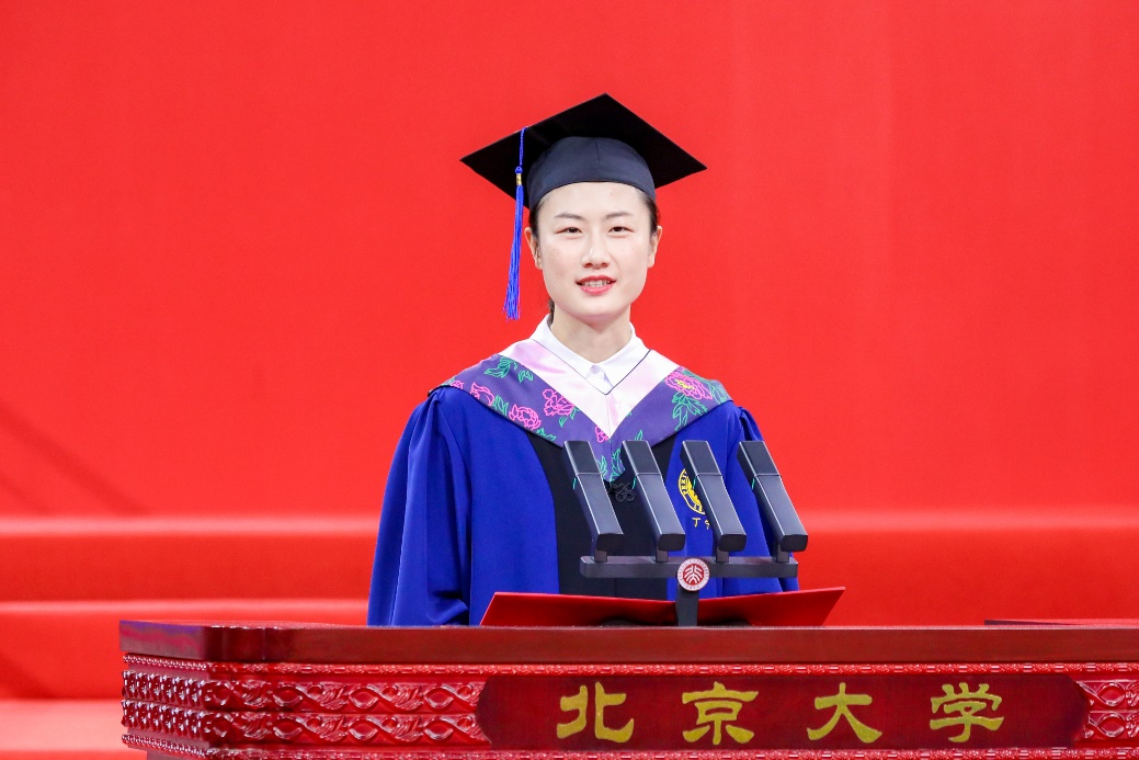 毕业生代表体育教研部2021级硕士研究生丁宁回顾了她从职业运动员到北大学子的心路历程。从一路收获冠军与荣耀的中国乒乓球队员到北京大学研究生学子,身份的转变让她面临着未知的挑战,但北大开放包容的学风、多元丰富的课程以及师长前辈细心的教导让她更加自信。临别之际,丁宁寄语即将奔赴五湖四海的北大学子,要永不停止追逐的步伐,追梦追光,不负时代。