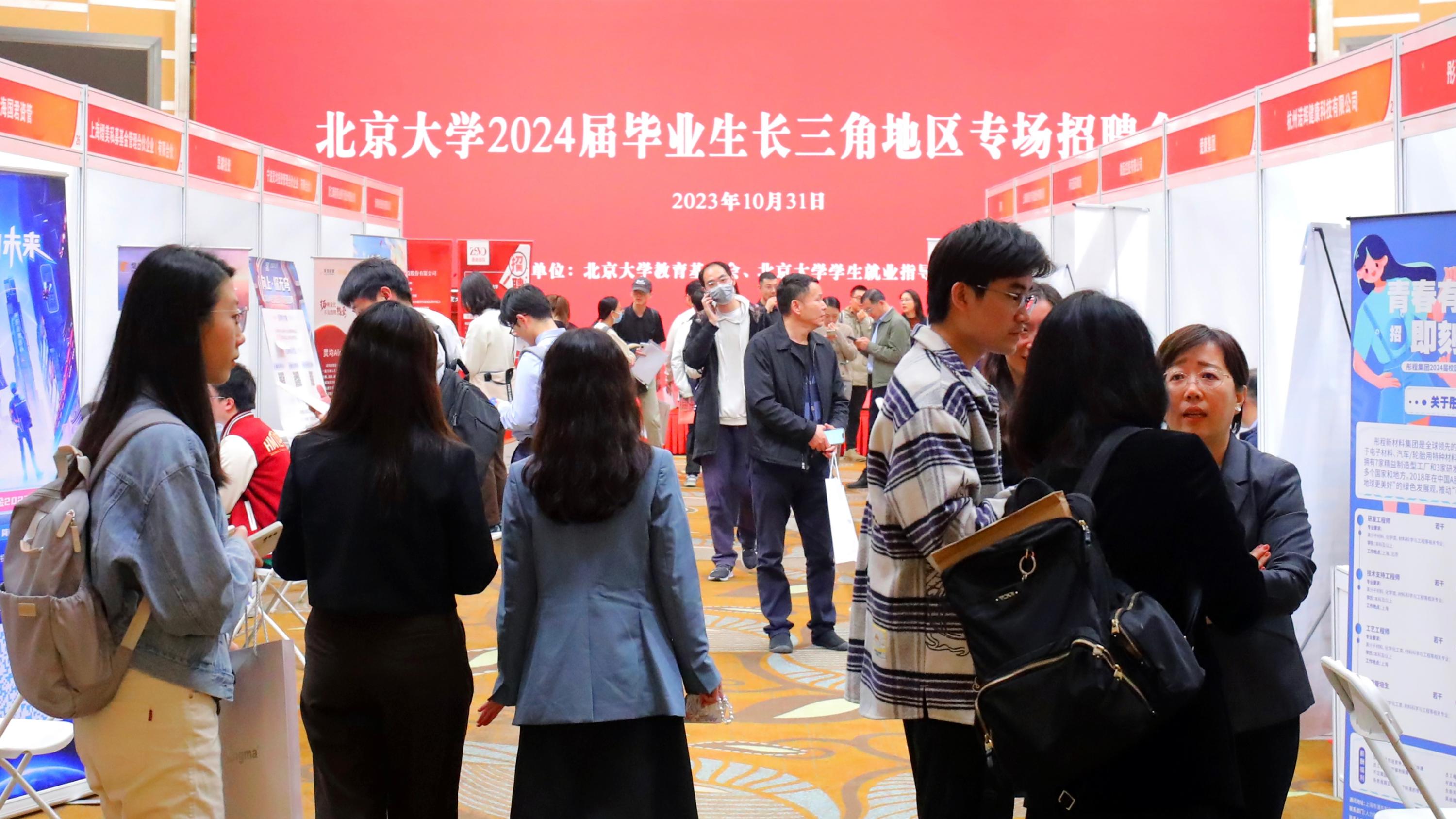 金秋十月燕园聚,广纳英才促发展。10月31日下午,由北京大学教育基金会联合北京大学学生就业指导服务中心举办的北京大学2024届毕业生长三角地区专场招聘会在英杰交流中心阳光厅成功举办。本次招聘会共吸引近50家长三角地区的重点企业、金融机构和科研院所到场参会,参与学生近400人。