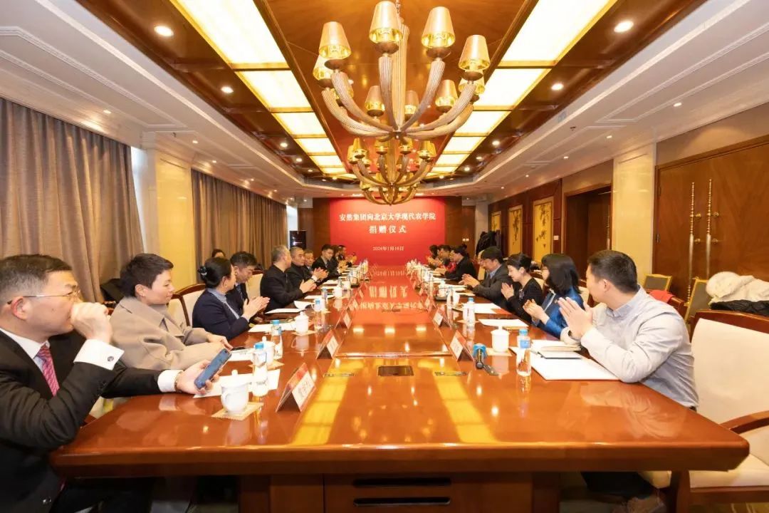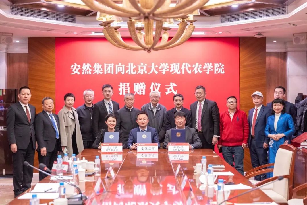 1月10日下午,安然集团向北京大学现代农学院捐赠仪式在北京大学英杰交流中心举行。安然集团董事长刘润东、执行总裁贾孟鹤、副总裁兼植物干细胞研究院院长张明臣、副总裁刘金雨、副总裁刘金坤等集团高管,北京大学前校长、现代农学院名誉院长许智宏,现代农学院院长刘春明,新农村发展研究院院长黄季焜,北京大学教育基金会副秘书长耿姝,现代农学院副院长彭宜本、刘承芳、西鹏等有关领导出席仪式。捐赠签约仪式由西鹏主持。