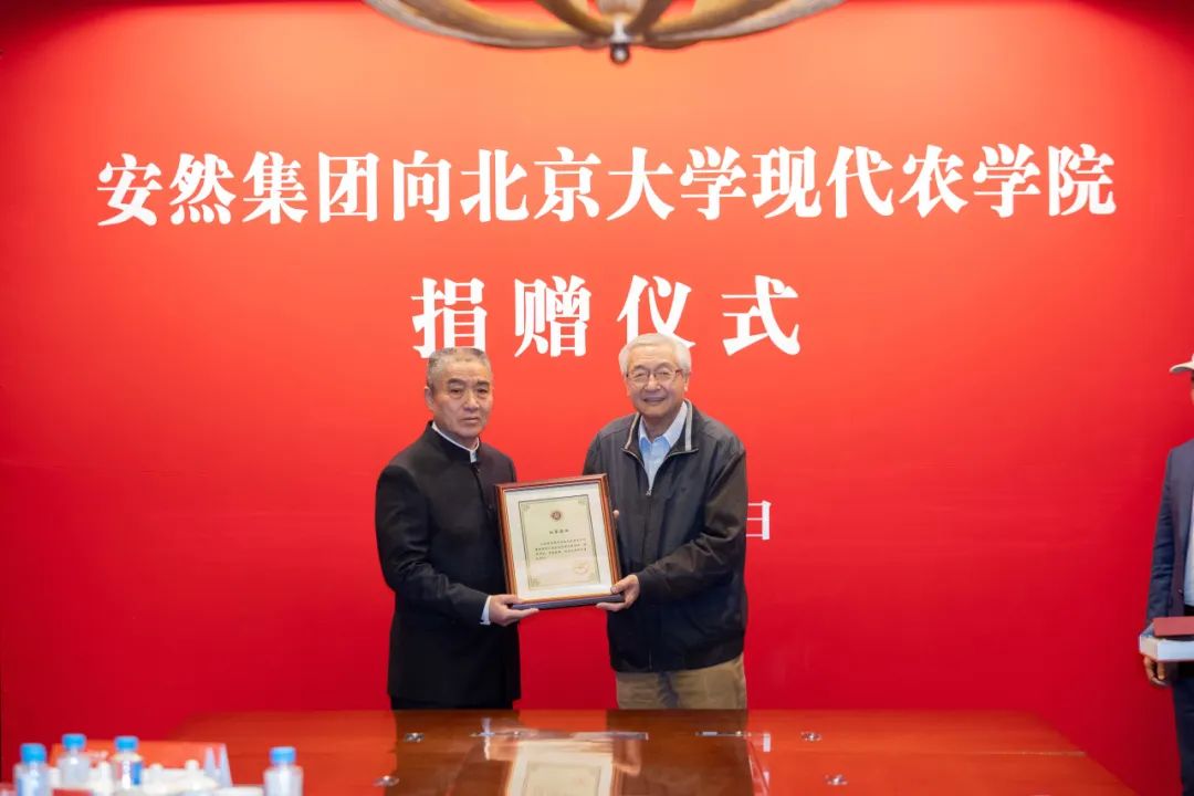 刘润东对现代农学院的热情接待表示感谢。他指出,安然十几年专注纳米健康领域,立志成为技术卓越、管理先进、国际一流的全球化智能化大企业,为服务百姓的身心健康,为振兴民族企业,为中华民族的伟大复兴添砖加瓦,贡献力量。他高度赞扬北京大学的家国情怀与人文底蕴,充分认可现代农学院良好的建设前景和发展潜力,希望本次捐赠助学能够为青年学子成才、国家和民族发展尽一份力量。他表示,未来集团将和学院一道,扎根中国大地,服务国家战略,为中国农业现代化、社会主义新农村建设贡献力量。