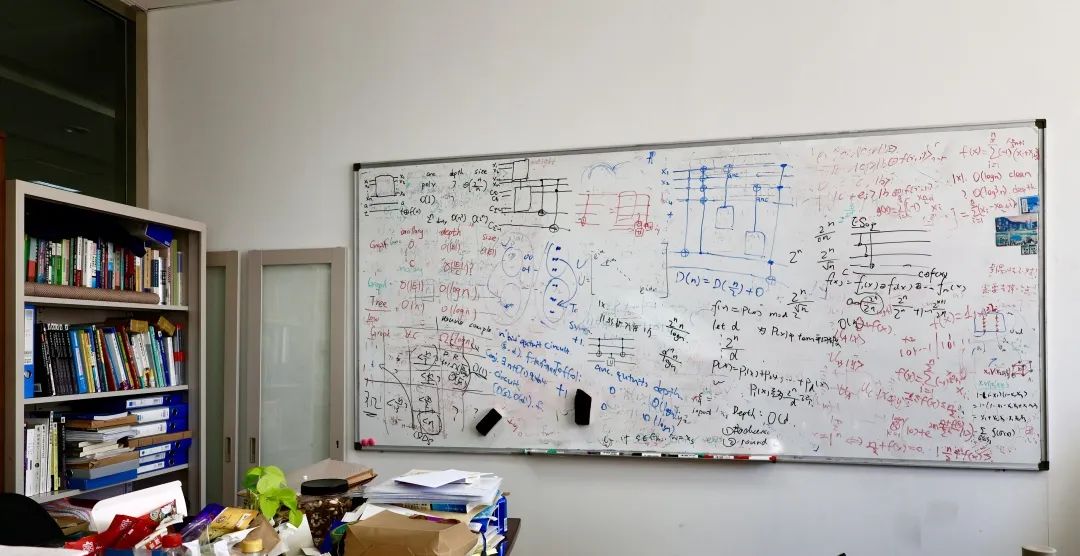 走进中国科学院计算所8楼孙晓明的办公室,感觉进入了书本的海洋,左右两侧靠墙边高高的书架上放满了书籍,两张办公桌子上也全是书籍,最显眼的就是一进门正前方的一块写满数学公式的白板。孙晓明笑着告诉记者:“我和学生们会经常就一些数学问题探讨,这些都是讨论的时候写的。”