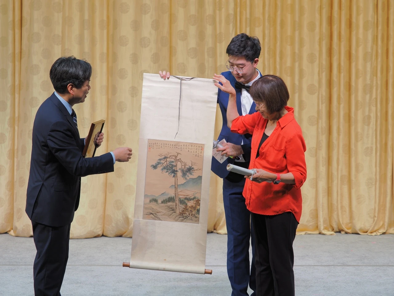 演出由北京大学艺术学院博士生、来自英国的歌剧歌手菲比和北京大学教工昆曲古琴协会的牛红伟担任主持人。正式演出前,由金德立女士、北方昆曲剧院孙明磊书记、北京大学教育基金会赵琳副秘书长、北京大学昆曲传承与研究中心陈均主任相继致辞,祝贺演出的成功举办。金德立女士回忆其姐姐传习中国传统艺术的心志与历程,孙明磊书记历数北方昆曲剧院与北京大学的情谊,赵琳副秘书长对中华优秀传统文化走出国门的期待、陈均老师对教职工群体在昆曲传习中的意义的叙述,都非常让人感动。金女士向北京大学捐赠其父金祖康先生创作的两幅字画:《梅庵古松图》《渔父辞》,陈均老师回赠《游园惊梦》螺钿漆画桌屏。全国政协京昆室副主任杨承志女士、北京大学工会常务副主席张宝岭老师、北京大学工会副主席张小萌老师、北京大学工会文体部部长朱博雅老师、北京大学教育基金会欧美部副部长陶娟老师等嘉宾莅临现场并观看了演出。北京大学历史学系朱青生教授来到剧场,为饰演杜丽娘的爱徒岳嘉宝助阵。北京大学人文社会科学研究院院长助理韩笑老师与部分邀访学者共同观看演出。北方昆曲剧院刘巍、王晶、王锋、赵军、李欣、王丽媛、周虹、王瑾、潘晓佳、刘鹏建等领导与艺术家亲临现场把关。两百余位北大同学及校内外昆曲爱好者与演职员们共情互动,剧场气氛热烈,尤其是最后由全体演员合唱由曲学大师吴梅先生于1918年为北京大学二十周年纪念创作的《北京大学校歌》时,“弦诵一堂春”“待培养出文章气节少年人”深深感染着剧场里的每一位观众。