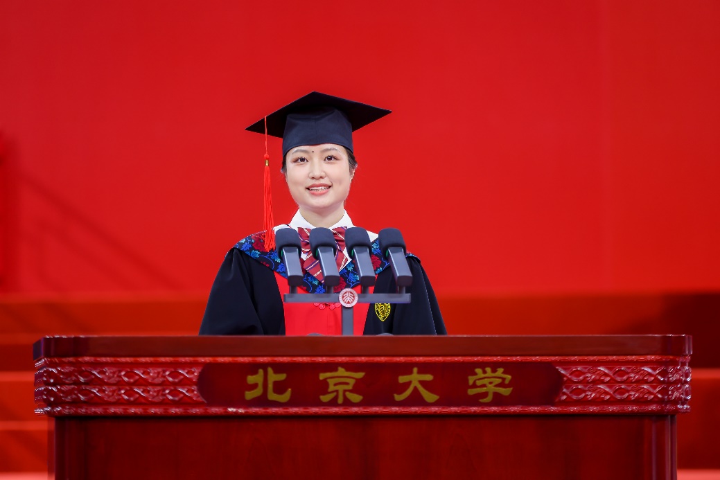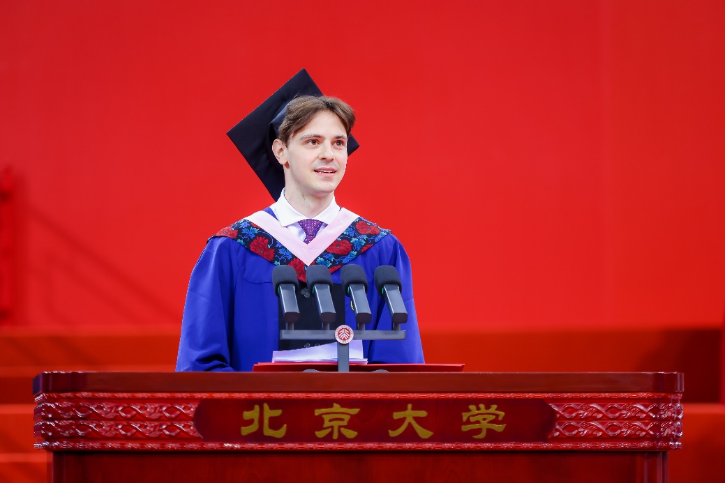 毕业生代表、北京大学国际关系学院2022级德国籍硕士生海洋讲述了自己与中国结缘、与北大结缘的故事,在北京大学两年的学习生活,让他浸润在北京大学浓厚的学术氛围中突破自我、茁壮成长。他表示,自己将在未来继续秉持初心,带着“北大人”的精神与担当,致力于推动中德中欧的经贸往来与文化交流。他代表所有留学生向北大送上感谢与祝福,并祝愿所有毕业生前程似锦。