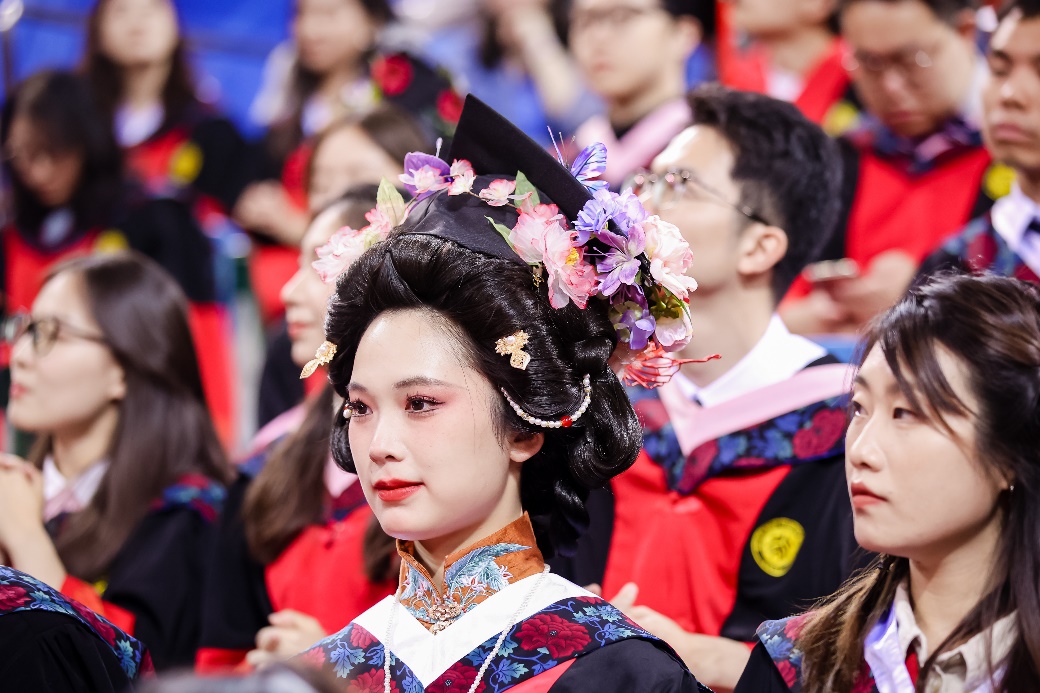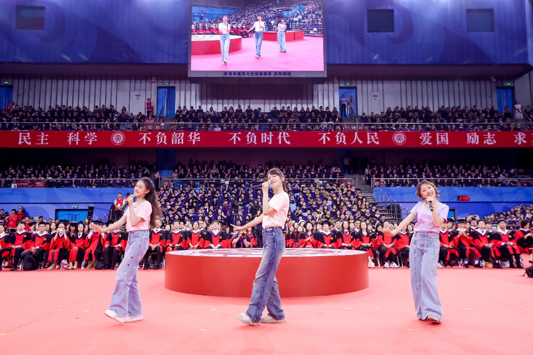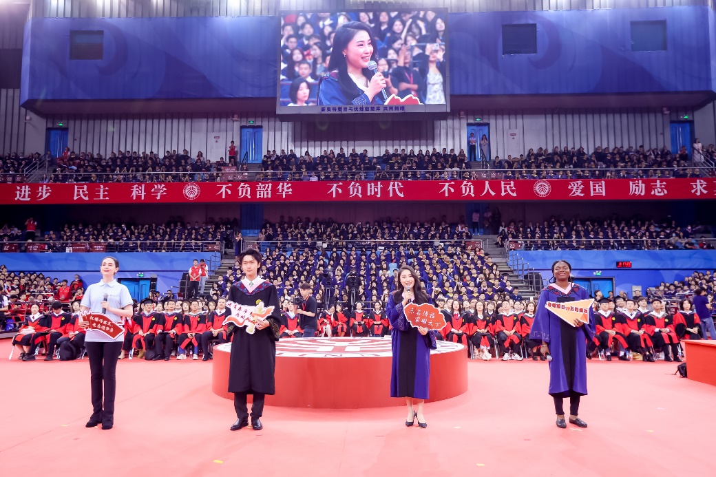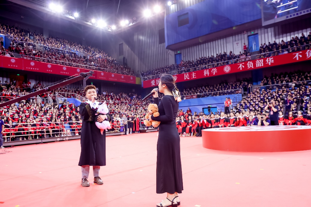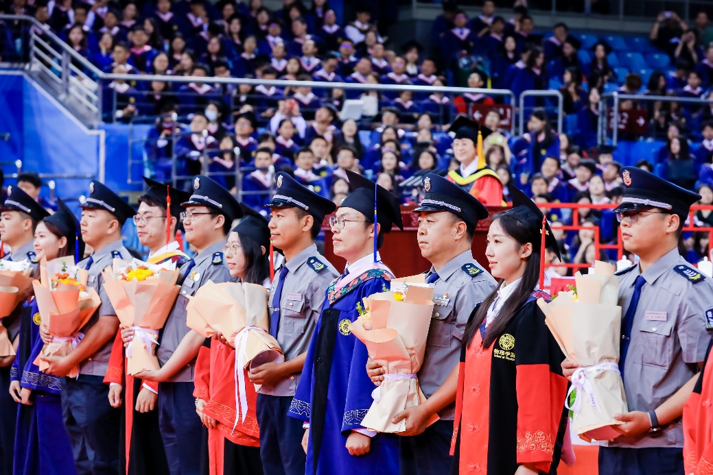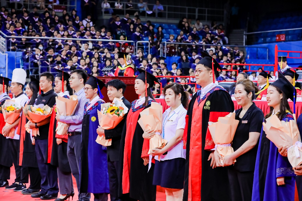 同学们顺利完成学业的背后,离不开很多人的默默陪伴和辛勤付出,这些人的日夜坚守,为大家创造了良好的学习环境,他们是导师、教务员、班主任、辅导员,是楼长大姐、食堂大厨、保安小哥、保洁阿姨……他们通过视频的形式,表达了对毕业生们饱含真情的祝福和期待。毕业生代表向他们献上鲜花,表达感激之情。