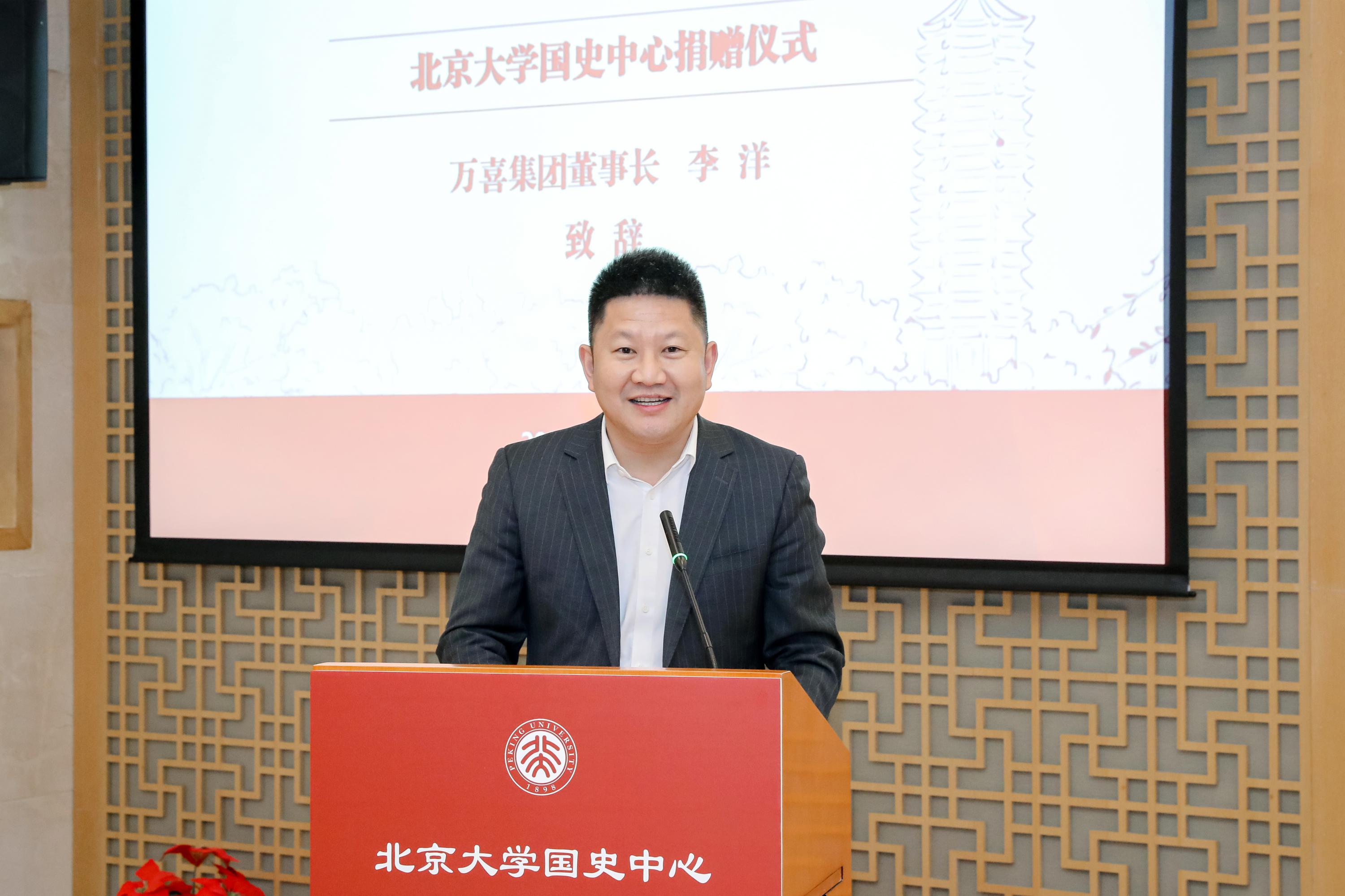李洋介绍了近年来万喜餐饮集团的发展成绩,分享了当初在北大求学的初心,表达了多年来始终持有的对历史的爱与敬意。他表示,捐资支持国史中心的发展具有重要意义,相信中心将在历史文化资料的发掘、保存、研究和宣传教育的道路上不断攀登新的高峰,为传承和弘扬中华优秀历史文化作出更大贡献。