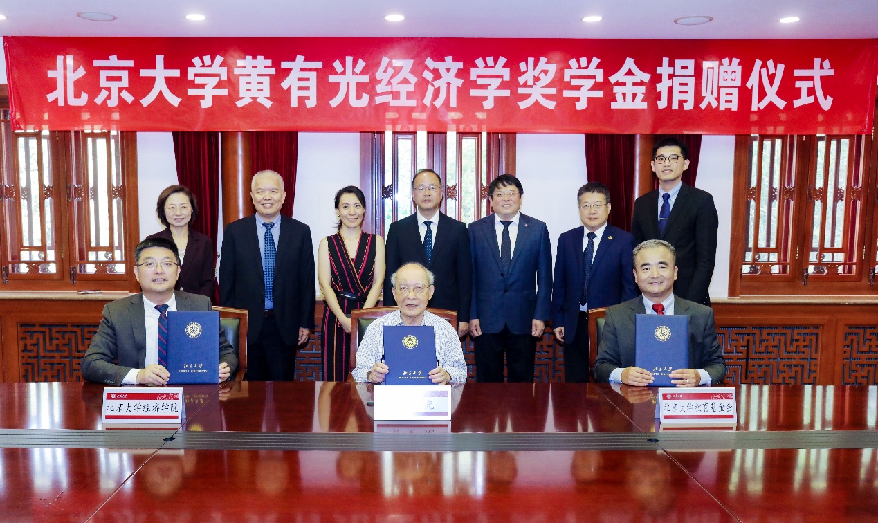 黄有光、李宇宁、张辉共同签署捐赠协议,何光彩向黄有光颁发北京大学杰出教育贡献奖。