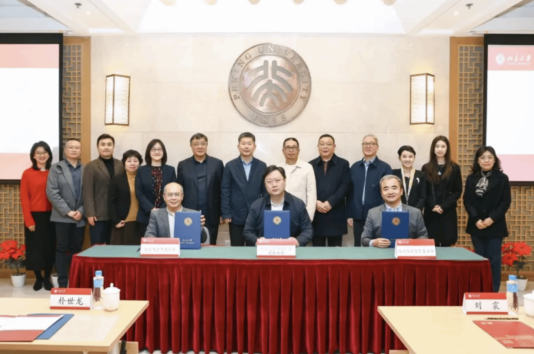 刘震、李宇宁、何晋共同签署捐赠协议。朴世龙代表北京大学向刘震颁发北京大学教育贡献奖。