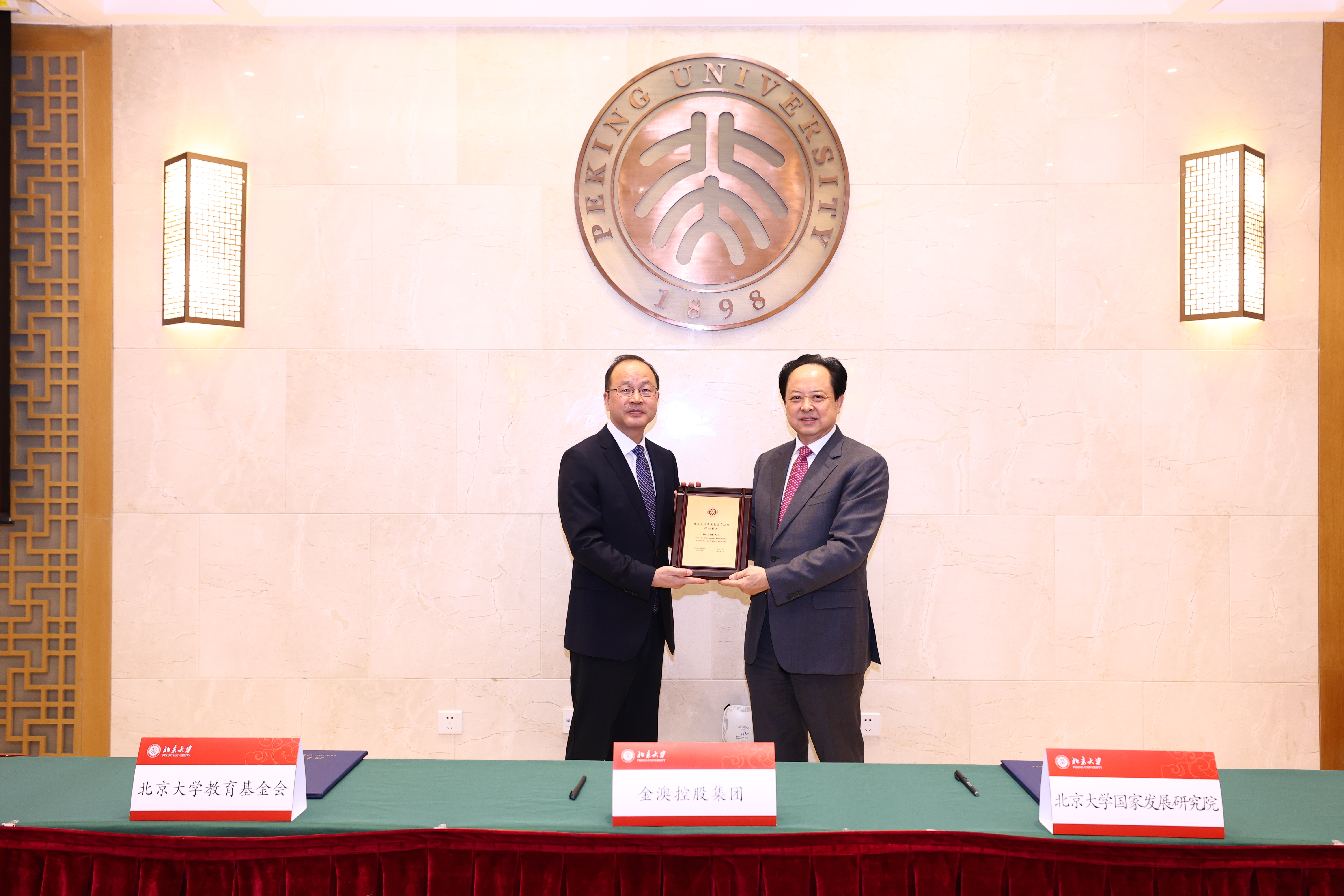 舒心与黄益平、教育基金会秘书长李宇宁共同签署捐赠协议。何光彩向舒心颁发“杰出教育贡献奖”。