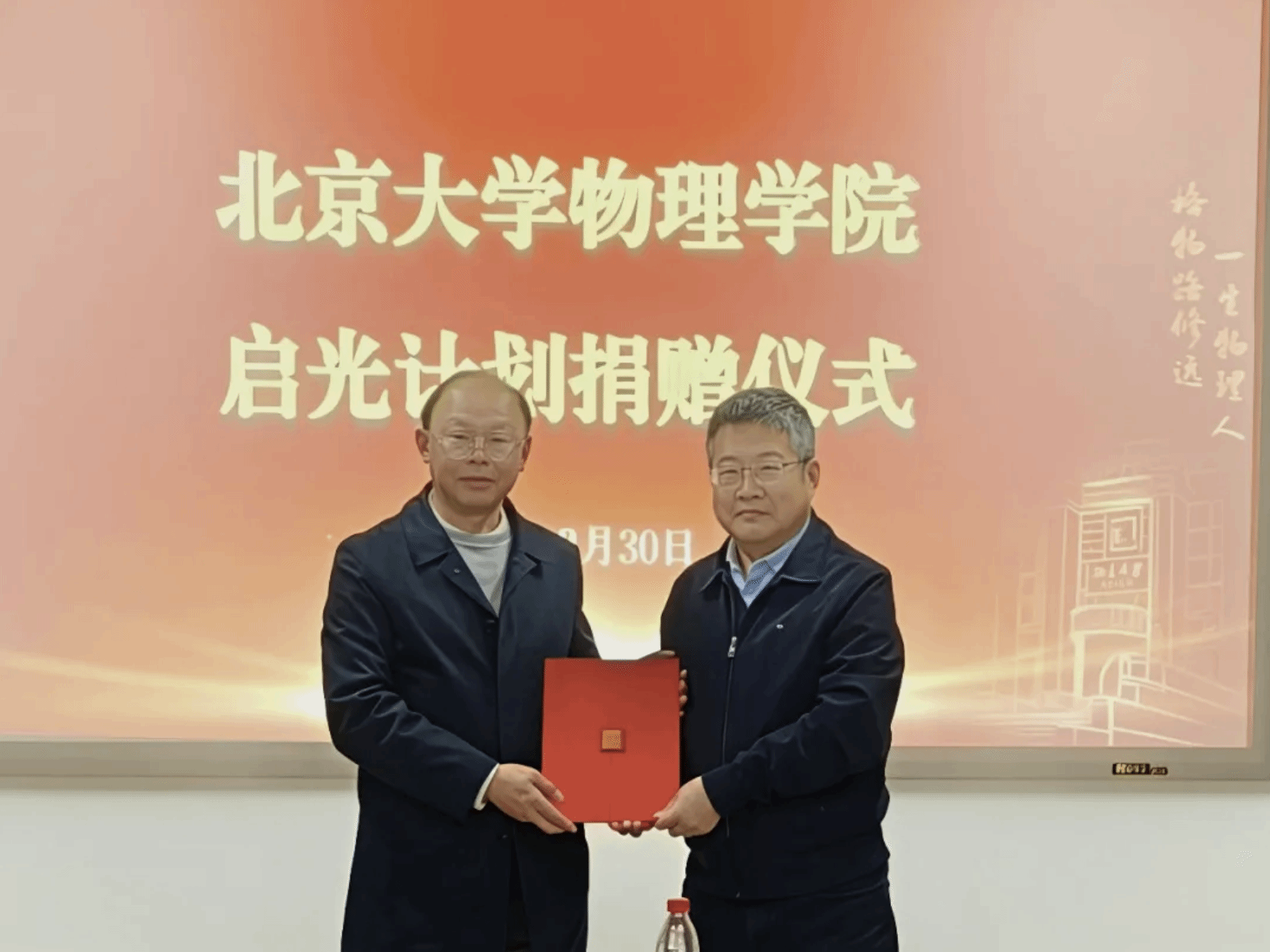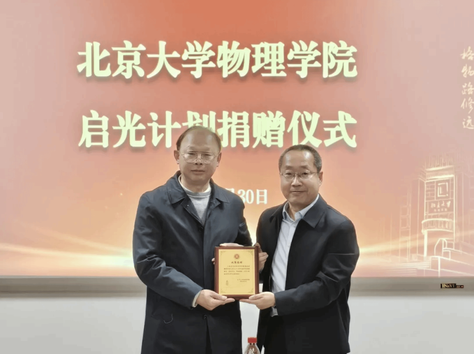 2026年3月30日,北京大学物理学院“启光计划”捐赠仪式在物理学院西楼举行。上海启光自然科学发展基金会(简称“启光基金会”)发起人、家辉教育集团创始人彭家辉,理事长、上海师范大学教授束金龙,秘书长朱劼等嘉宾出席仪式;北京大学教育基金会秘书长李宇宁、副秘书长王勇,北京大学物理学院党委书记刘雨龙、副院长曹庆宏、林熙,党委副书记穆良柱等师生代表参加活动。仪式由穆良柱主持。