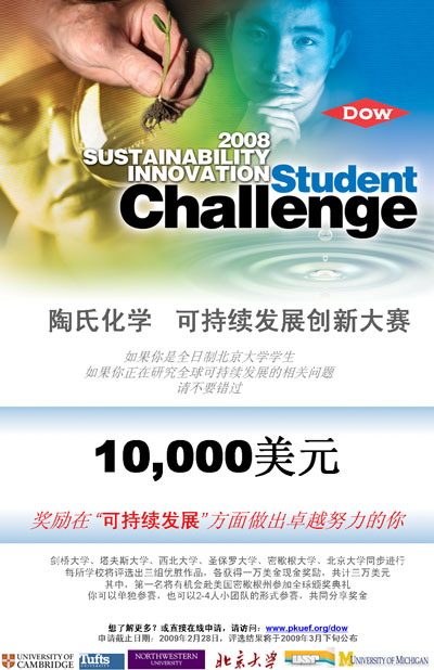 2008年,陶氏化学公司(DOW)捐资在北京大学设立“陶氏化学可持续发展创新大赛”项目。本创新大赛奖金将用于我校奖励在可持续发展创新研究中有杰出成果、品行端正、综合能力强的在校学生,共3名,每位奖金为美元壹万元(USD10,000)。