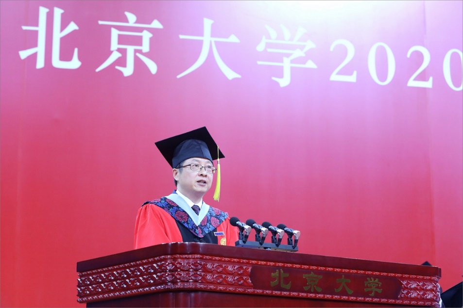 郝平代表学校全体师生员工热烈欢迎同学们回家。他表示,今天是北京大学建校123周年的校庆日,也是五四运动102周年,举行这场学位授予仪式,具有特殊的意义。今天的相聚来之不易、弥足珍贵,正是在以习近平同志为核心的党中央的坚强领导下,我们党团结带领全国人民,取得了抗击新冠肺炎疫情斗争重大胜利的结果。在这场艰苦卓绝的历史大考中,无数北大人和全国众多抗疫英雄一道,不畏艰险、冲锋在前、舍生忘死,展现了伟大的抗疫精神。郝平向在这场战斗中付出辛勤努力和做出巨大牺牲的人们致以最崇高的敬意。