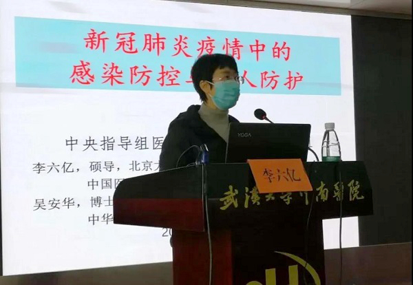 1月21日,接到上级部门通知要紧急出发去武汉,时间紧迫甚至连一件行李都来不及准备,她从医院直接赴机场。到武汉的第二天一早,李六亿就立刻开始投入工作。为医务人员进行院感防控相关知识的技能培训,到综合医院发热门诊、定点医院等进行现场感染防控的指导。