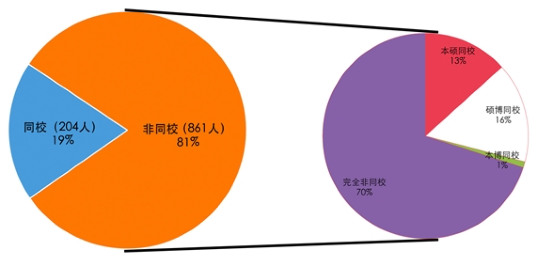 1065位自然科学、工程技术科学、农业科学、医学科学和管理科学领域的院士中,本硕博完全同校的仅有204人;其余864位院士中,有约70%是完全非同校,即本科、硕士、博士均在不同高校就读(详见图1)。