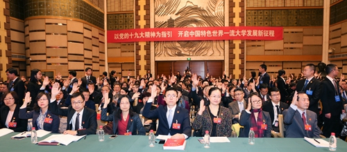郝平代表学校第十二届党委作题为《以党的十九大精神为指引 开启中国特色世界一流大学发展新征程》的报告。报告共分五部分:五年工作回顾;继承和发扬北大光荣传统,明确历史使命与历史方位;聚焦七大任务,加快“双一流”建设;突出五大重点,全面深化综合改革;打铁必须自身硬,开创党建和思想政治工作新局面。