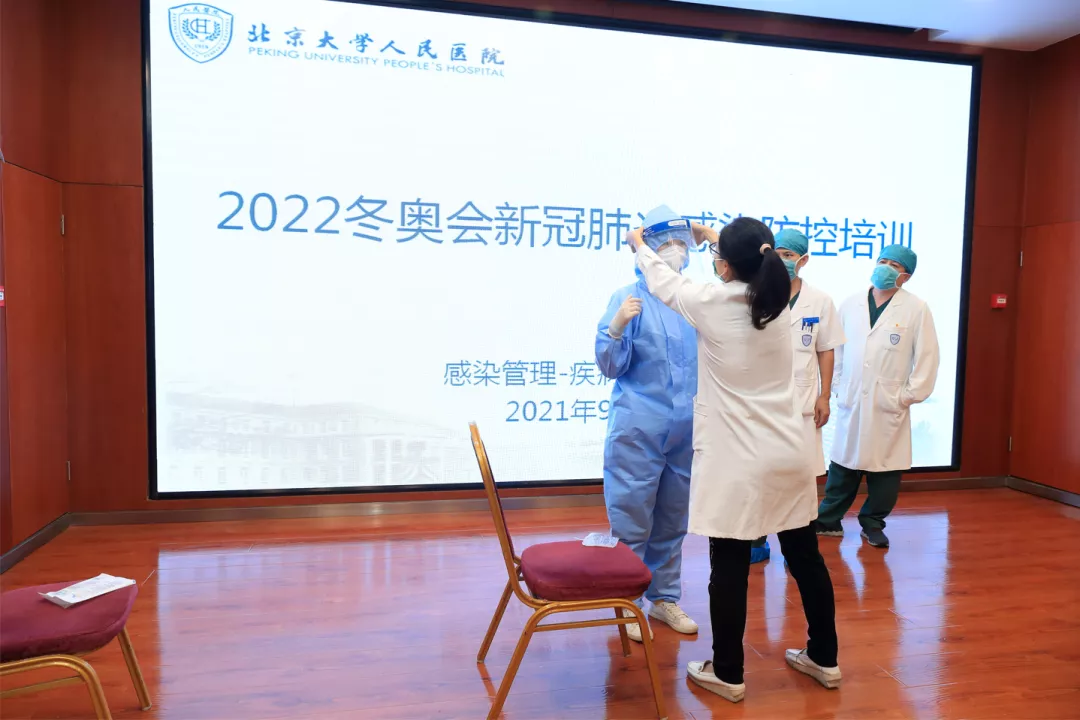 为了让每位保障队员以最好的状态投入到冬奥服务当中,各团体分批次组织参与了奥运会保障的相关人员完成培训与考核:有针对通用知识、传染病防治等理论知识的详尽讲解,有大型活动医疗急救保障专项实操,也有冬奥英语及跨文化交流能力培训。在疫情防控常态化背景下,还有救治高风险闭环人员、穿脱防护用品等技能训练。其中,北医三院遴选具有援鄂抗疫经验的医务人员和感控专家组成感控专家组,协同建立简明扼要的中英文电子病历模板,既减少了医务人员的暴露风险又提高了救治效率。专家组还组织编写并印发了《冬奥会和冬残奥会感染防控指导手册》,方便大家随时学习。