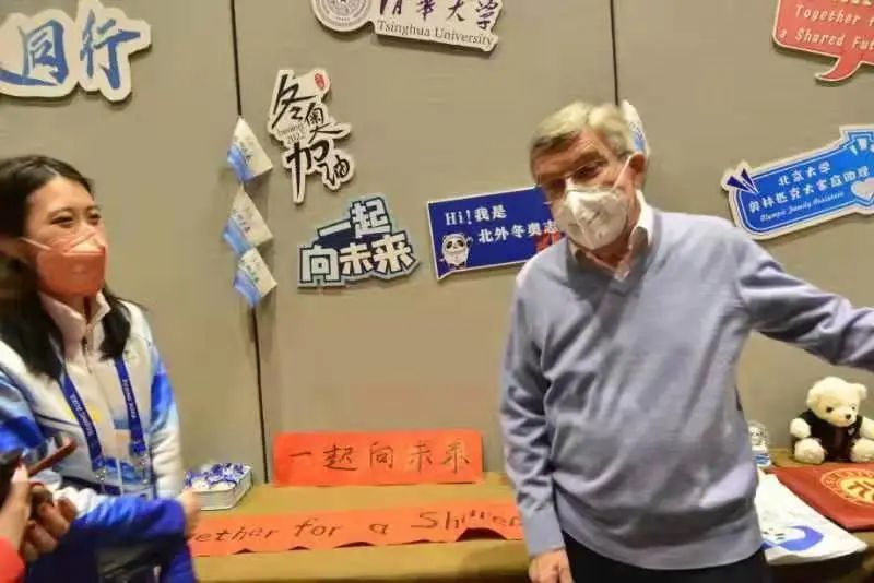 巴赫对北京大学奥林匹克大家庭助理志愿者们作出的贡献表示感谢,为志愿者们送来了虎年的新春祝福,“像老虎一样充满斗志、充满力量、充满勇气、充满快乐。”北京大学冬奥志愿者、哲学系2020级硕士生屈文鑫带领巴赫参观了志愿者同学们书写的春联,介绍了春联的美好寓意,巴赫还跟她学习了“一起向未来”的中文发音。对此,巴赫说,“你们从事的工作值得自豪,也将从中深刻地体会到‘一起向未来’的意义。”