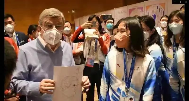 在演讲结束后,北京大学冬奥志愿者、心理与认知科学学院2021级博士生周娜为巴赫送上为其现场创作的人物肖像速写。巴赫表示感谢,称赞周娜很有天赋。在了解到周娜的专业是心理学后,巴赫说道心理学就是需要懂得去鼓励他人,给人阳光与温暖。