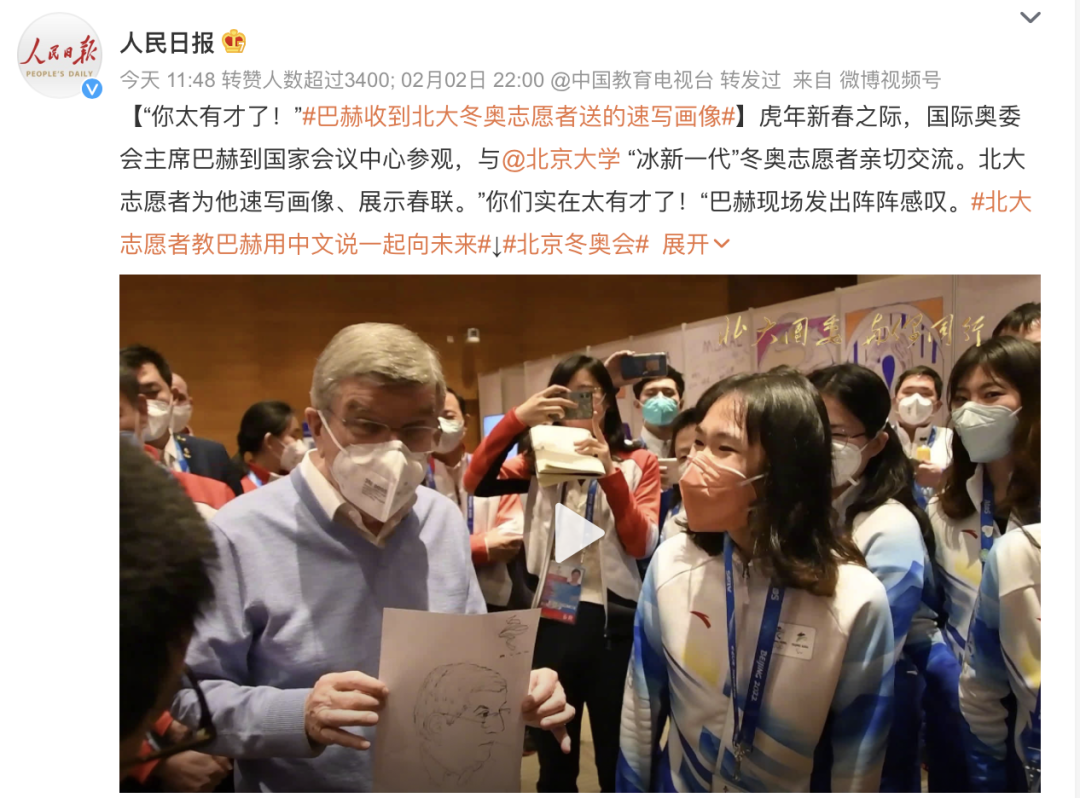 看到北大志愿者为他速写画像、展示春联,巴赫现场发出阵阵感叹“你们实在太有才了!”最后,巴赫举起“一起向未来”横幅,与志愿者们合影留念。