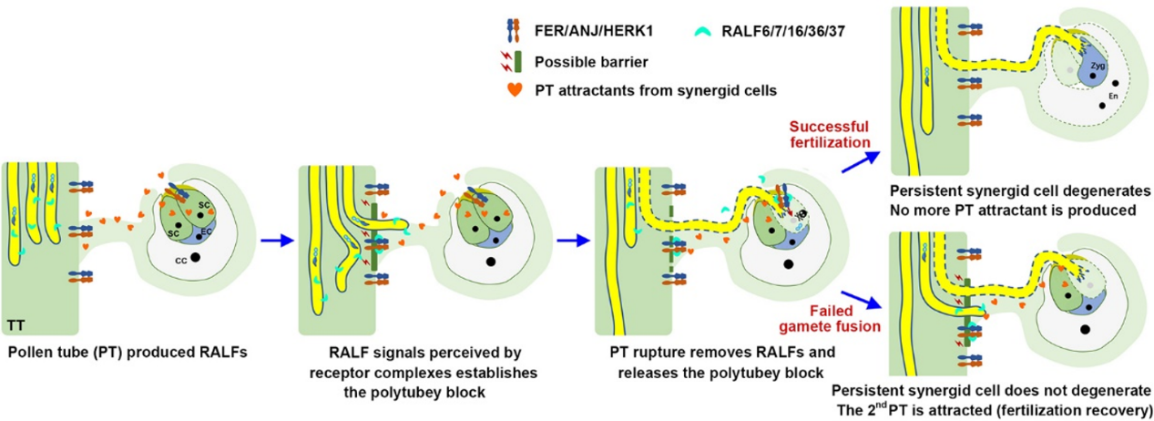 1、花粉管分泌RALF小肽。2、隔膜处的受体复合体接受RALF信号,建立防止多花粉管穿出的屏障。3、花粉管爆裂后RALF急剧减少,隔膜处的屏障解除。4、受精成功后,宿存助细胞降解,吸引物质失活、减少。5、配子融合失败后,胚珠吸引第二根花粉管进行受精补偿。Cc,中央细胞;Ec,卵细胞;Sc,助细胞;En,胚乳核;Zyg,合子