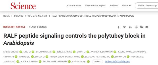 2022年1月20日,北大生命科学学院瞿礼嘉教授实验室的研究论文“RALF peptide signaling controls the polytubey block in Arabidopsis”以长文形式在国际著名期刊《科学》(Science)上在线发表,该论文揭示了模式植物拟南芥通过小肽信号及其受体介导的信号通路防止多精受精的分子机制,即每个胚珠仅允许一根花粉管穿出花柱道的隔膜进入其内进行受精。这是瞿礼嘉教授实验室继2017年阐明花粉管爆裂释放精细胞的分子机制(Ge et al.,Science2017)、2019年阐明拟南芥通过种属特异性的花粉管吸引信号实现“同种花粉优先”的分子机制(Zhong et al.,Science2019)之后在植物生殖生物学领域中取得的又一个重要突破。