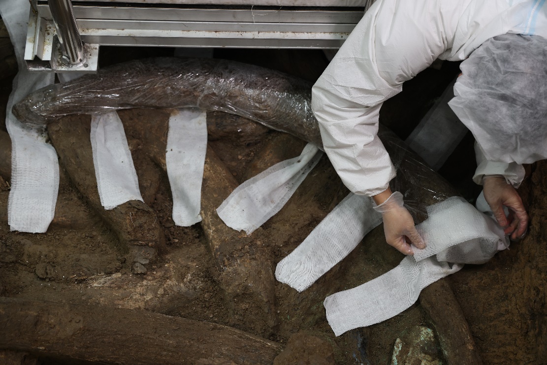 文保人员在8号坑中对象牙进行打包作业