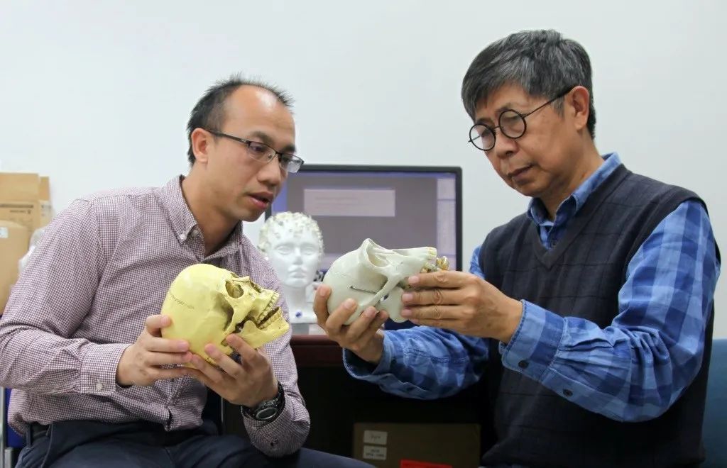 孔江平与吴西愉老师在研究黑猩猩和人类头骨模型
