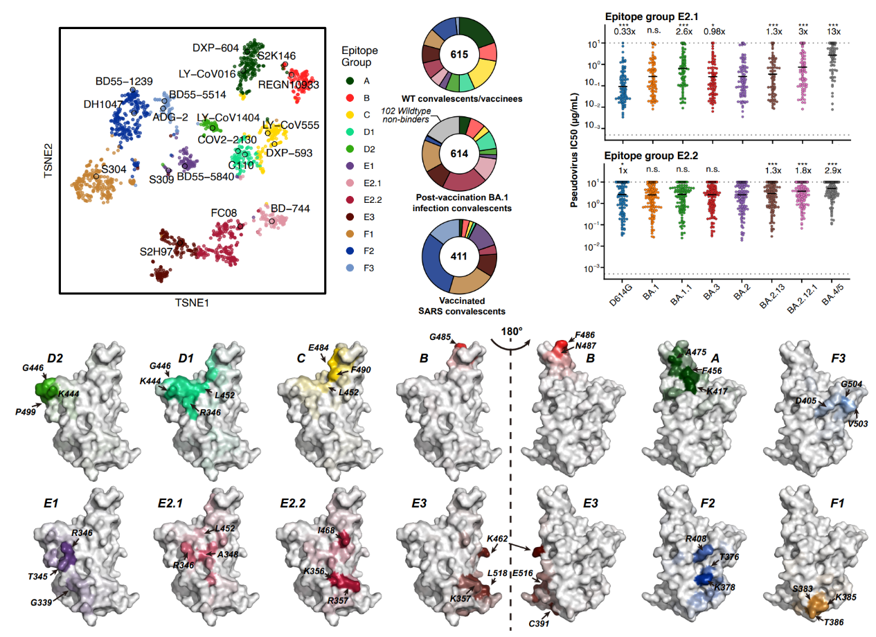 为了进一步探究奥密克戎突变株的中和抗体逃避机制,团队利用高通量深度突变扫描技术确定了1640 个与RBD结合的抗体的逃逸图谱、表位分布和对奥密克戎株中和功效,其中614个和411个分别来源于BA.1 康复者血浆和接种新冠疫苗的SARS康复者血浆。通过对逃逸图谱的无监督聚类,抗体分为A、B、C、D1、D2、E1、E2.1、E2.2、E3、F1、F2、F312类,数据表明属于同一类内的抗体有相似的结合抗原和中和特征,各类抗体的主要逃逸位点与该类代表性抗体在复合物结构中的结合表位一致(图4)。