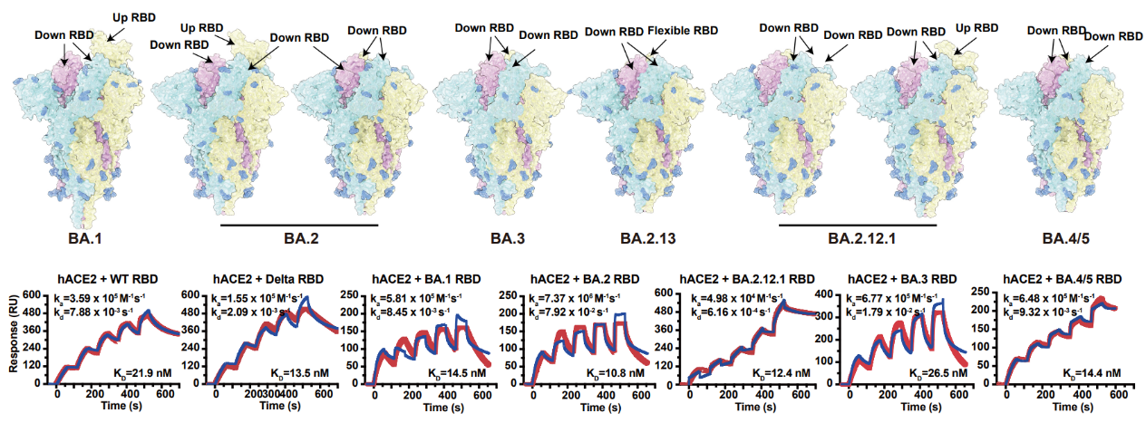 目前主要的奥密克戎变异株都具有较高的传播能力,为了研究其传播能力与刺突蛋白(Spikeglycoprotein)构象和受体结合能力的关系,合作团队解析了奥密克戎变异株BA.2、BA.3、BA.2.12.1、BA.2.13以及BA.4/5刺突蛋白三聚体的冷冻电镜结构,并分别测定各突变体刺突蛋白或受体结合域(RBD)与hACE2的亲和力。结构分析表明,BA.4/5携带的F486V突变可能导致hACE2亲和力下降,但L452R和493Q回复突变降低了这一影响。研究结果显示BA.2.12.1、BA.2.13和BA.4/5对hACE2的亲和力与BA.2相当(图1)。