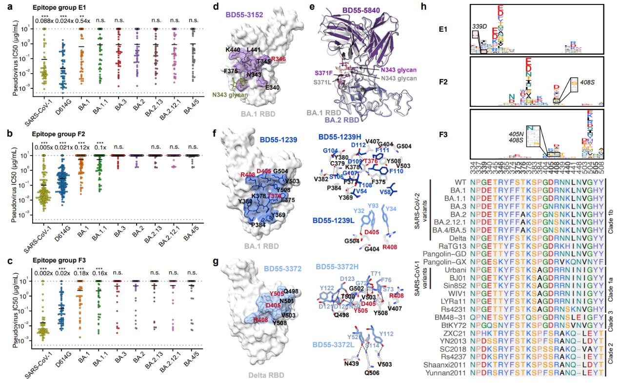 假病毒中和实验和结构分析表明,SARS-CoV-1/2 RBD交叉结合的广谱中和抗体集中分布的表位(E1、F2、F3)也都受到BA.2、BA.2.12.1、BA.2.13和BA.4/5所携带的S371F、D405N、R408S突变的影响。其中E1类抗体由于S371F引起的局部构象变化导致亲和力下降,F2/F3类抗体多数被D405N和R408S突变逃逸。这表明乙型冠状病毒B支系(sarbecovirus)的广谱中和抗体也在很大程度上被奥密克戎BA.2、BA.2.12.1、BA.2.13和BA.4/5变异株逃逸(图6)。