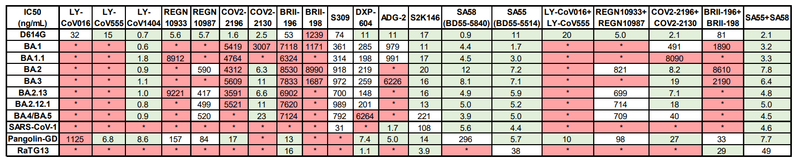 对抗体药物的研究也印证了奥密克戎株新亚型高度的中和抗体逃逸能力,多数现存抗体药物对奥密克戎中和活性大大下降。BA.2、BA.4和BA.5携带的S371F、D405N和R408S位点突变导致大部分乙型冠状病毒广谱抗体(如S309)失活,而LY-CoV1404(Bebtelovimab)和COV2-2130(Cilgavimab)仍然对BA.2.12.1和BA.4/BA.5保持中和活性。此外,团队筛选出了一对表位不冲突的广谱乙型冠状病毒中和抗体组合SA58和SA55,该抗体对能高效中和包括奥密克戎株新亚型在内所有流行过的突变株,以及非典病毒,RaTG13,Pangolin-GD等Sarbecovirus病毒,有望成为兼具强效预防和治疗效果的药物(图3)。