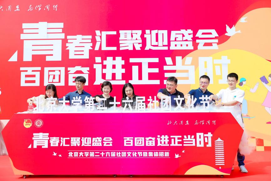 9月29日中午12时,第二十六届社团文化节启动仪式正式开始。北京大学党委副书记、副校长宁琦,北京大学团委书记户国栋,优秀社团指导教师代表艺术学院教授、京昆社指导教师顾春芳,体育教研部副主任、冰上运动联合协会指导教师郑重,团委副书记李鸿、鞠晓,社团学生代表陶炫臻共同启动装置,缓缓弥漫的白色水雾间,本次文化节的主题标语随之升起。在秋日阳光的映照下,北大社团人更显青春风采,北大社团文化更显昂扬生机。