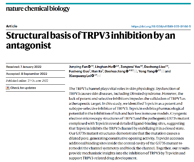 今年,雷晓光还荣获了“科学探索奖”,这也是他去年后第二次参评。正好在今年他的团队在化学生物学与创新药物开发领域又取得了一项重大科研突破:揭示了靶向TRPV3离子通道蛋白小分子抑制剂的作用机制,并证实它具有治疗多种皮肤疾病的潜能。