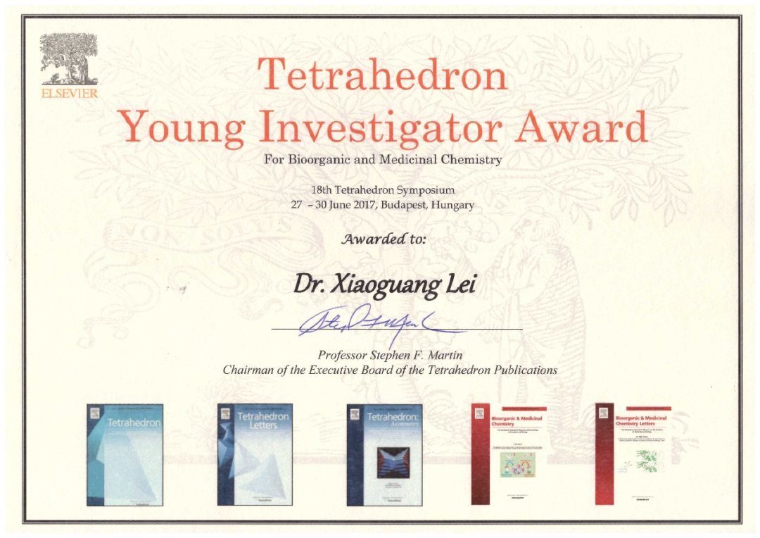 除了“屠呦呦奖”,雷晓光教授还荣获20余个国内外重要学术奖项。2017年6月28日,在匈牙利布达佩斯举办的第18届国际四面体学术会议上,国际出版集团Elsevier将2017年“四面体青年科学家奖(Tetrahedron Young Investigator Award)”授予了雷晓光,表彰他在化学生物学、天然产物合成、以及创新药物研发等研究领域所做出的一系列杰出工作。四面体青年科学家奖是一项重要的国际学术奖项,每年在全球遴选2名40岁以下青年科学家,分别表彰其在有机化学或化学生物学、药物化学领域做出的开拓性贡献。之前的获奖人包括多名美国科学院院士和诺贝尔奖得主。雷晓光作为第一位中国以及第一位亚洲学者,在化学生物学与药物化学领域荣获了该奖项。他应邀在第18届国际四面体学术会议上做了大会报告。同时Elsevier出版集团旗下的Bioorganic & Medicinal Chemistry杂志也专门出版了一期特刊来纪念雷晓光教授获得该奖项。