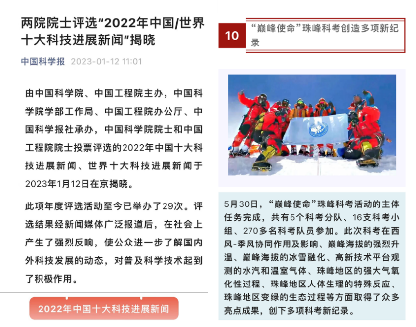 由中国科学院、中国工程院主办,中国科学院学部工作局、中国工程院办公厅、中国科学报社承办,中国科学院院士和中国工程院院士投票评选的2022年中国十大科技进展新闻、世界十大科技进展新闻于2023年1月12日在京揭晓。其中,“巅峰使命”珠峰科考创造多项新纪录入选“2022年中国十大科技进展新闻”。