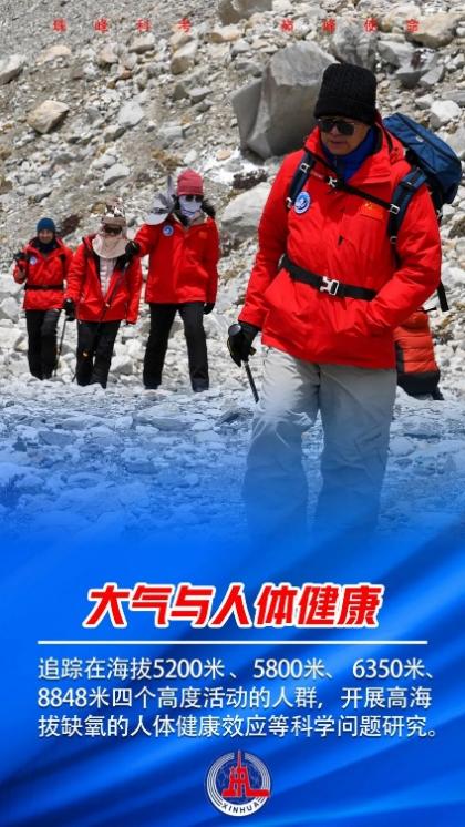 研究团队把自己和此次科考队员作为实验对象,佩戴测量血氧、心电监测的传感器,肩负登山包,拄着登山杖,在珠峰登山大本营和绒布冰川之间,5800多米的海拔以上,负重前行,来回徒步穿梭,同时收集实验对象血样、尿样、唾液等标本,测量血压和脉搏波传导速率等心血管健康指标。借此,团队首次获得急进高原人群对极高海拔的生理适应数据等。该研究将为深度解析高原生理适应机制、改善高原人民生命健康提供重要依据,助力解开珠峰地区“臭氧与人体健康科学关系之谜”。