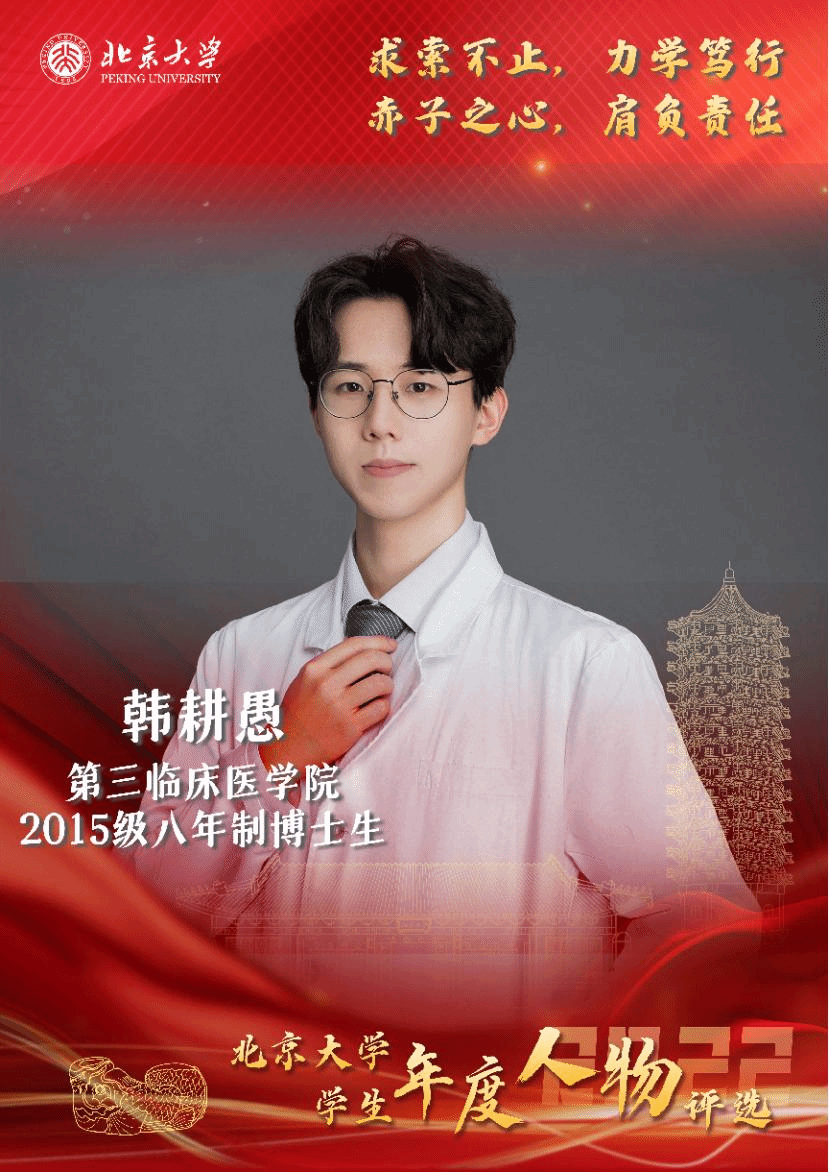他多次获得国家奖学金、北京市三好学生等16项校级及以上荣誉。作为北大医学办学110周年庆祝活动的学生代表发言,韩耕愚将致力于让所有脊柱疾病的患者能够挺起脊梁。“青山难阻鸿鹄志,弱水如帆助我行”,相信他将继续在医学之路上砥砺前行,努力成为堪当民族复兴重任的时代新人。