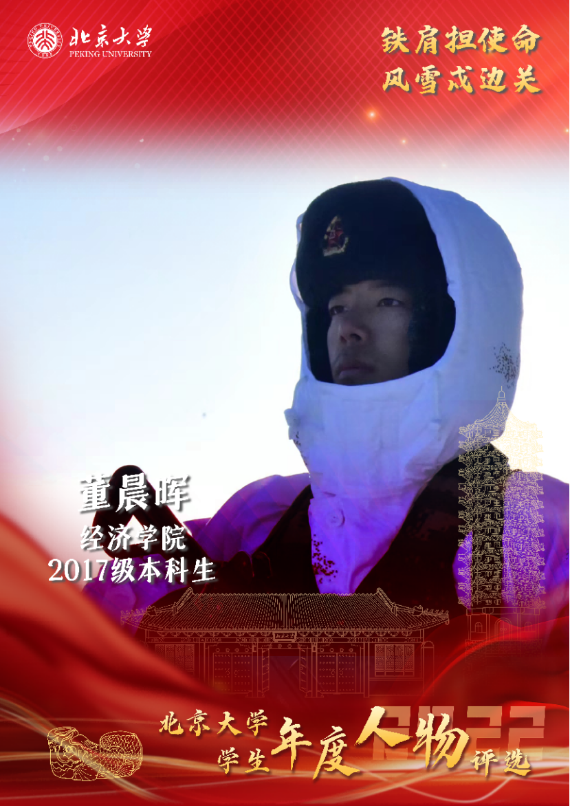 2019年9月,20岁的董晨晖背负行囊,挥别湖光塔影,奔赴雪域边防。在部队的两年中,他累计执勤3000多小时,在平凡的岗位上为祖国边防事业奉献青春价值。董晨晖坚信:当兵,就要当最好的兵。他训得最狠,练得最勤,闻令而动,参加了数不清的紧急任务,最终荣获“四有”优秀士兵两次、嘉奖两次、“优秀新兵”一次,并在部队光荣入党。服役期间,所在连队荣立集体二等功一次、集体三等功一次。