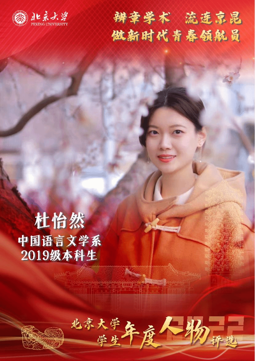 她沉潜读书,磨砺学术意志。在北京大学中文系悠久的学术传统和严谨的学术氛围的感染下,杜怡然刻苦研读经典,曾连续两年综合素质测评位居第一名,两次获得国家奖学金。