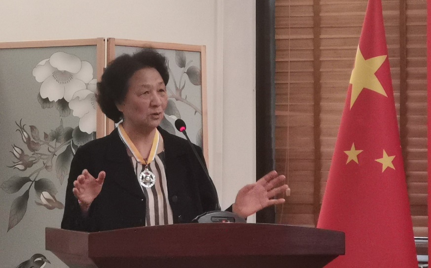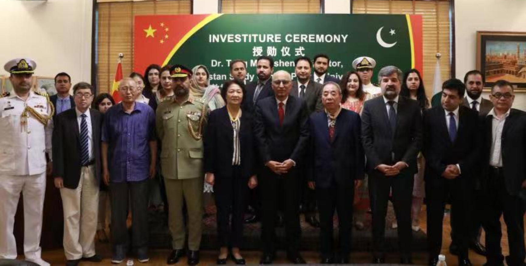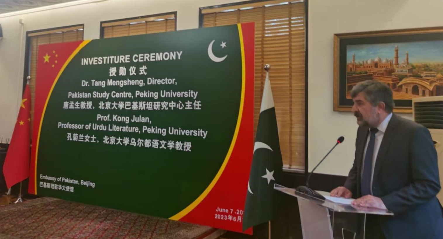 仪式由奏响中巴两国国歌开始,莫因·哈克代表巴基斯坦政府致辞。他表示,巴中两国友谊源远流长、历久弥坚,是全天候战略合作伙伴和“铁哥们”;在两国友谊建立和加深的过程中,唐孟生、孔菊兰等专家学者所作出的贡献非常重要。哈克回顾了两位老师在巴基斯坦的学习与工作经历及学术方面的成就,感谢他们50年来在乌尔都语教学科研、人才培养、巴中人文交流等方面作出的重要贡献。他强调,两位教授是深化巴中文化交流和教育合作的热心建设者,当下两国人员往来、旅游合作和文化交流日益深入,希望两位教授与北大同仁一道,持续推动巴中教育合作提质升级、加强民间友好交流,巩固两国友谊纽带。